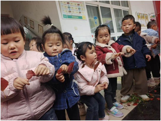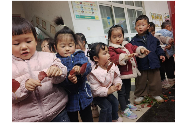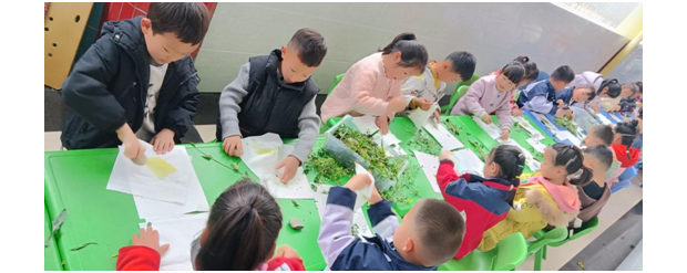 大班的活动最是热闹,“花草风铃”环节中,孩子们一起拾叶子、粘花草,用一次性杯子做风铃主体,杯口打孔穿绳,画下春天的图画,绳下再缀上片片树叶,一串串风铃悬挂在走廊里,随风轻响,满目春色。