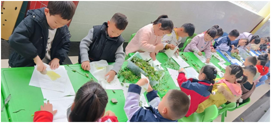 “敲染春天”环节里,孩子们用小方巾、木棍和鹅卵石,将植物的形状与颜色一下下敲印在布上,敲敲打打间,一朵花、一片叶便定格成了永不褪色的自然印记。
