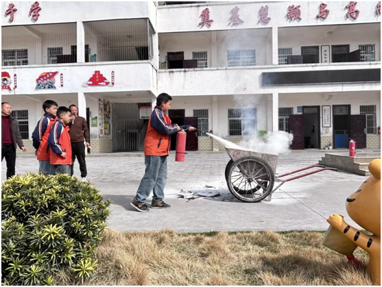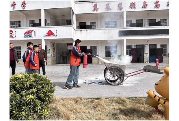 疏散演练结束后,学校在操场组织了灭火实操演练。演练小组提前准备好了火盆、灭火器等器材。学校相关负责人向师生们现场讲解了干粉灭火器的正确使用方法、灭火步骤及注意事项,强调了“提、拔、握、压”的操作要领。随后,学生代表在老师的指导下,亲自操作灭火器进行现场灭火,成功扑灭了火盆中的明火。通过“理论+实操”的方式,师生们不仅学到了防火知识,更掌握了扑救初起火灾的实际技能。