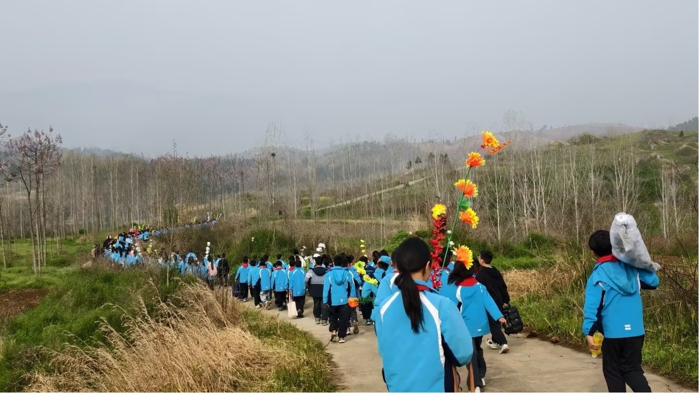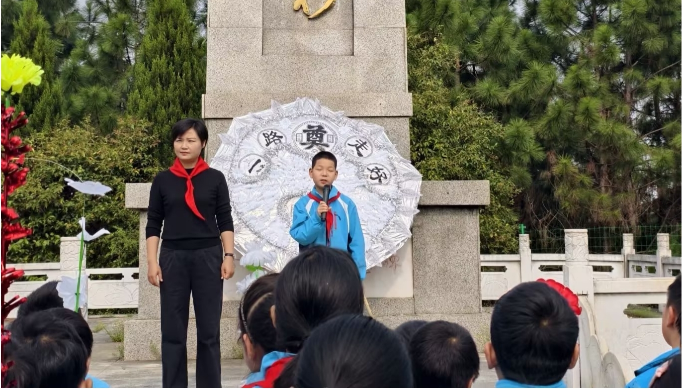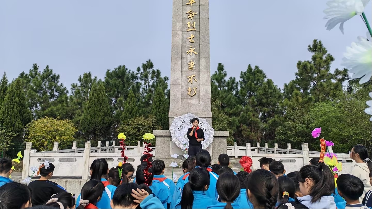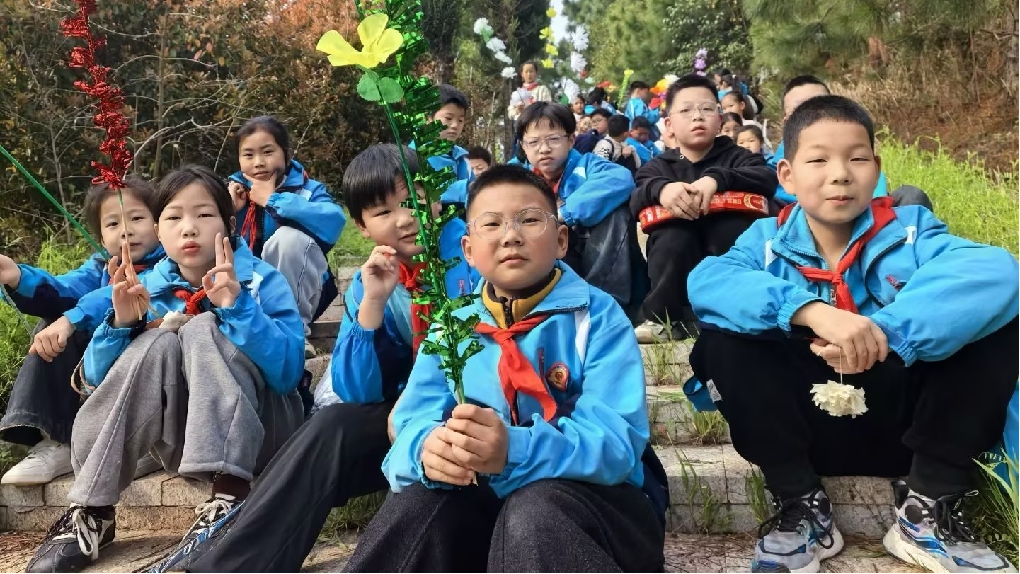清晨,学生们手持自制白花,列队出发。与以往不同,这次徒步被赋予了更深的内涵。行进途中,老师们适时讲述本地革命历史,将脚下的路与历史的脉络连接起来。更令人动容的是,不少学生自发地将沿途发现的纸屑、塑料袋等垃圾捡起,放入随身携带的环保袋中。“我们要让先烈长眠的地方,和我们走过的路一样干净。”一名高年级学生的话道出了孩子们纯朴的心声。这一自发行为,正是学校长期将德育融入日常、倡导“教育在窗外,世界是教材”的生动体现。从维护环境整洁到缅怀先烈荣光,责任与敬意的种子在行走中悄然播撒。 二、在庄严仪式中叩问初心