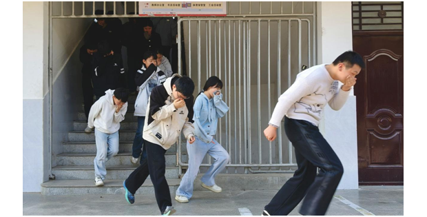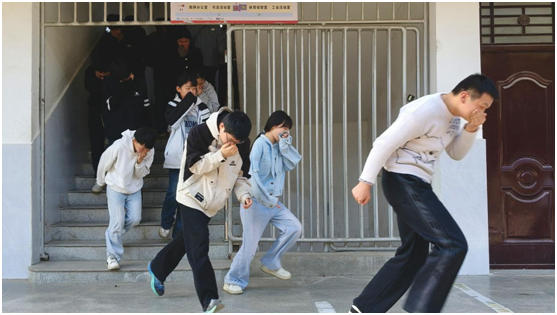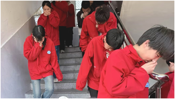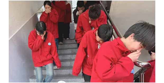 随着警报声响起,演练正式开始。全校师生迅速行动,在班主任和任课教师的引导下,学生们猫腰弓身,用毛巾、衣袖等掩住口鼻,按照“前半部分走前门、后半部分走后门”的要求,有序撤离教室,在走廊排成两路纵队靠右下楼。各教学楼楼梯口指挥员各司其职,在志远楼、骐骥楼各楼层引导疏散,全程做到不慌张、不拥挤、不停留。全体师生仅用3分52秒,就安全、快速疏散至学校大操场指定位置,各班体育委员迅速清点人数并向副总指挥汪德刚汇报,整个疏散过程紧张有序、衔接顺畅。