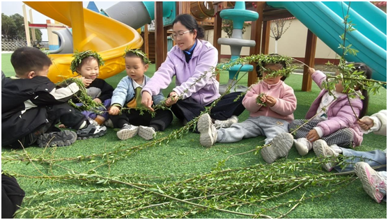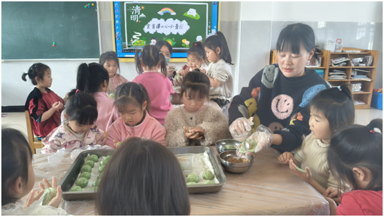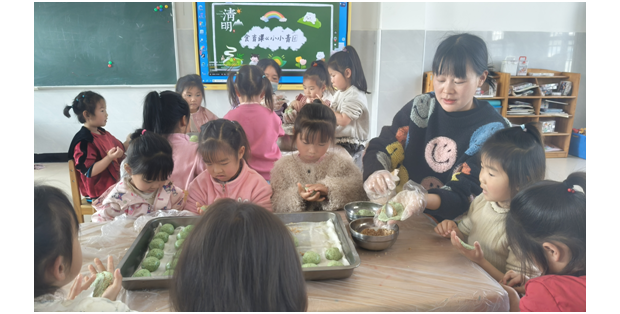 小班孩子手提竹篮“寻春插柳”,指尖触摸嫩绿柳枝——柳枝发芽,是生命生生不息的模样,老师轻声告诉孩子:每一个生命都值得珍惜,逝去的要铭记,眼前的更要珍爱。中班揉捏青团,碧绿的糯米团包裹甜香,孩子们在制作中懂得:记忆可以用味道传承,而此刻与伙伴、老师一起度过的时光,同样珍贵。大班放飞纸鸢,画笔描绘春日愿景,风筝高飞时,老师引导他们:思念可以飞向远方,但更要珍惜当下每一次奔跑与仰望。