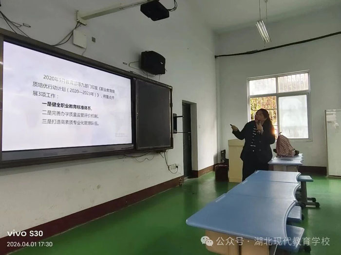 随州新闻网讯 (通讯员郝姣)4月1日下午,由随州市教科院主办,湖北现代教育学校承办的随州市2026年春季中职(技工)学校教研会议在随州市第一职业中学隆重举行,学校党委委员、副校长陈君致欢迎词,市教科院副院长吴军致开幕词。