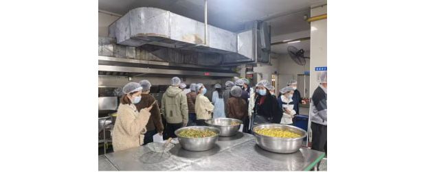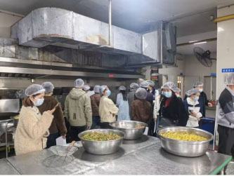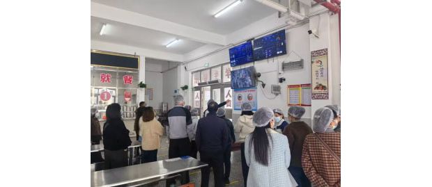 活动现场,六年级家长代表在学校负责人与后勤管理人员陪同下,有序参观食材储存区、清洗加工间、烹饪操作区、餐具消毒间及食品留样柜。大家仔细查看食材溯源凭证、卫生消毒记录、每日留样台账,实地观摩食材清洗、切配、烹饪全流程,直观感受食堂干净整洁的环境与规范严谨的操作流程。学校工作人员详细介绍了数字食堂运作情况,食材采购验收、营养搭配、成本管控、明厨亮灶数字化监管等工作,让家长全面掌握食堂运营细节。