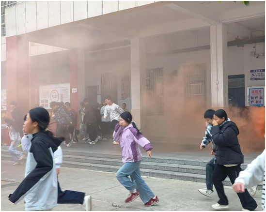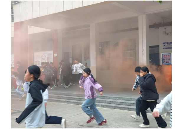 本次疏散演练严格按照实景化标准开展。演练前,学校周密部署方案,明确疏散路线、岗位职责与注意事项。随着校园广播响起紧急疏散警报铃声,现场同步燃放安全烟雾弹,模拟真实灾害场景,瞬间营造出逼真的应急氛围。各班学生在老师的沉着指挥下,弯腰捂鼻、紧贴墙根,严格按照既定路线和顺序,快速、有序、规范地撤离教学楼,直奔篮球场安全区域集结。