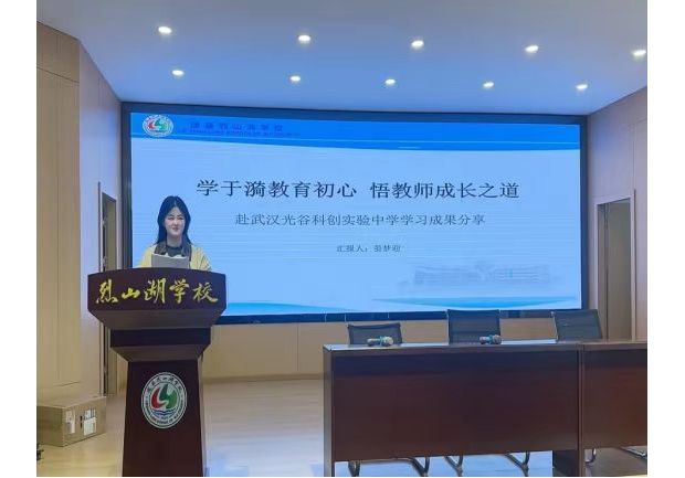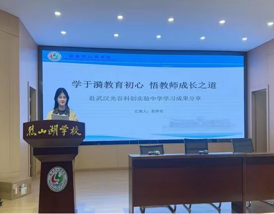 随后,外出参训教师代表上台分享学习心得。晏老师结合自身在光谷科创实验中学的所见所闻、所学所悟,畅谈学习于漪先生教育精神的真切感受,细数学校在教师培养、教育教学、校园文化建设中的宝贵经验。晏老师立足自身教学岗位,反思日常工作中的不足,畅谈未来专业成长规划,饱含青年教师对教育事业的憧憬与奋进之心,字字真切、句句走心。