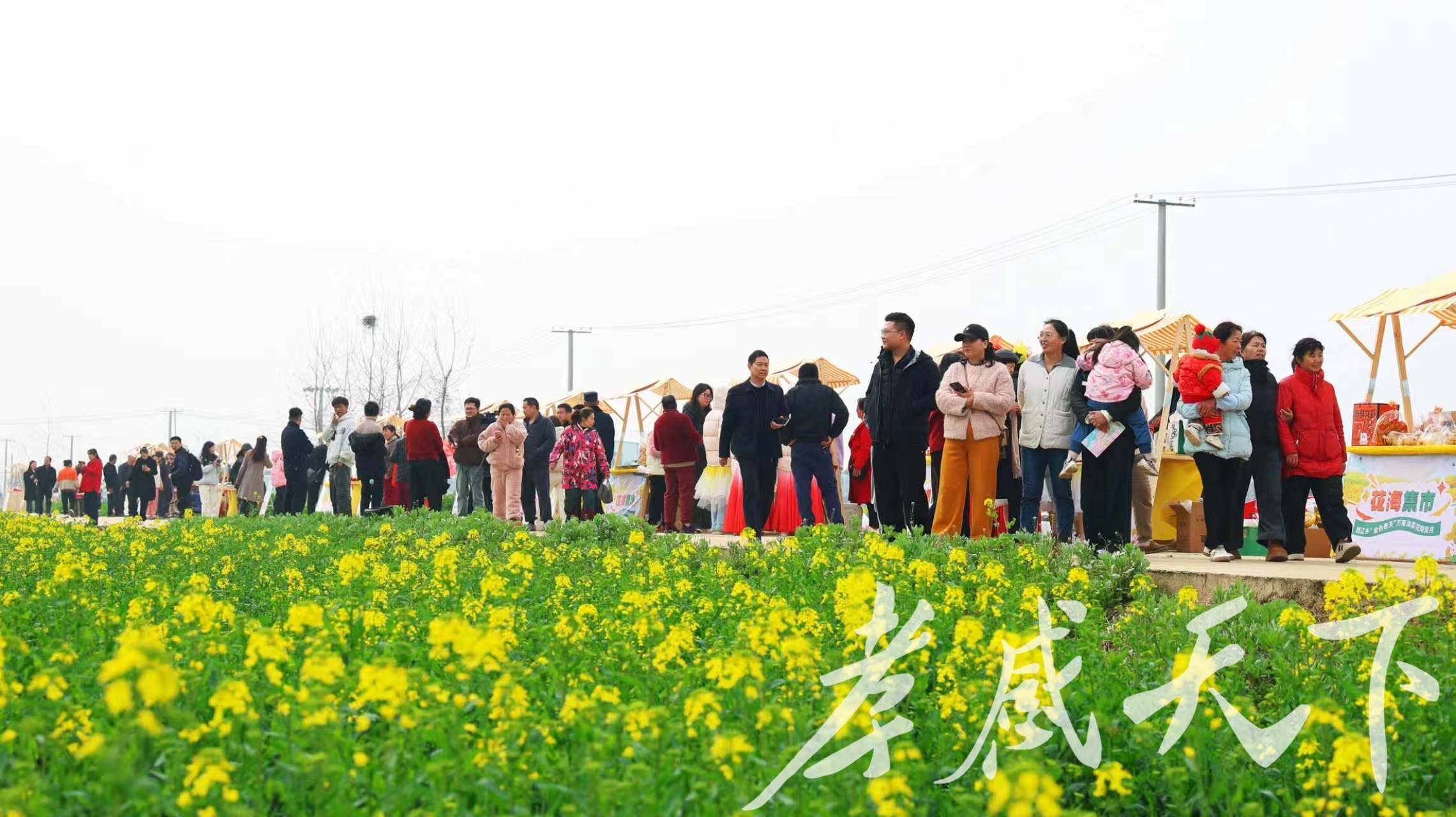 油菜花海旁边市集上游客驻足赏花。