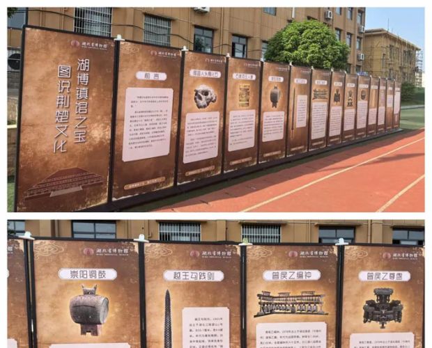 一块块图文并茂的文物展板依次介绍湖北省博物馆十大“镇馆之宝”:郧县人头骨化石、石家河玉人像、崇阳铜鼓、越王勾践剑、曾侯乙曾盘、曾侯乙编钟、彩绘人物车马出行图、虎座鸟鼓架、云梦睡虎地秦简、元青花四爱图梅瓶。全方位呈现荆楚文化的璀璨夺目与博大精深。