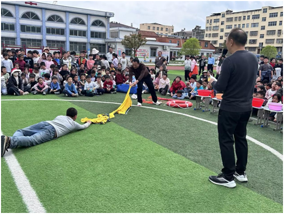演练现场,教师现场示范长竹竿施救、救生圈施救、长绳施救、衣物简易施救、无工具应急呼救五种实用岸上救援方法,分步演示规范动作,细致讲解安全注意事项,让全体学生看得懂、记得牢、学得会。唐县镇中心医院医护人员到校开展专业救护培训,现场演示溺水人员上岸后的应急处置和基础急救知识,有效提升师生应急避险和突发情况处置能力。