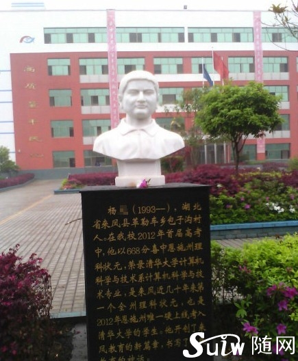 【恩施一高中为考上清华的学生立塑像】近期,恩施州来凤县某高中突然竖了一块雕像,雕像的原形是该校2012年高考时,以668分考上清华大学的杨同学。据称,杨同学是来凤近几十年来第一个全州理科状元,开创了来凤教育的新篇章,书写了平民教育的神话。