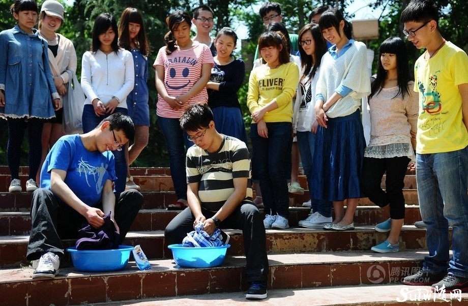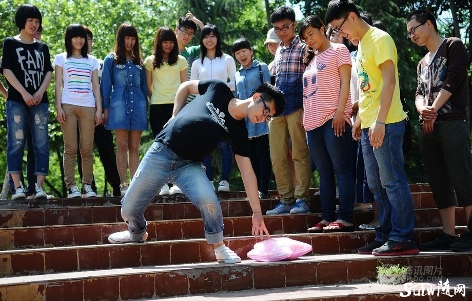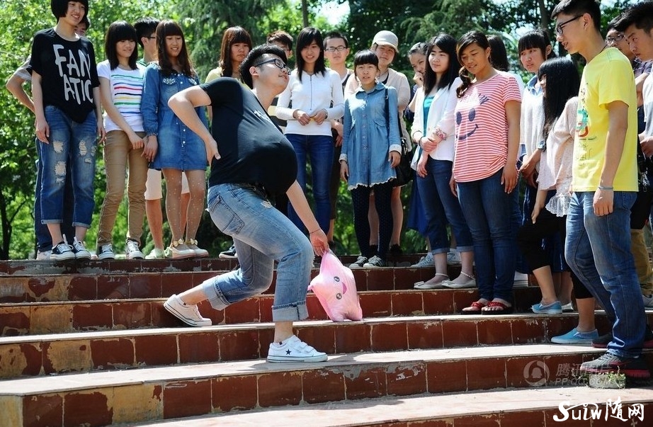 5月12日,山东聊城大学学生扮成“孕妇”模样捡东西,体验母亲十月怀胎的艰辛。新华社发(张振祥 摄)