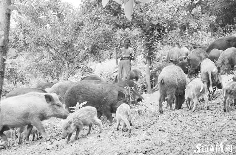 随县三里岗镇刘店村村民张大友承包500多亩山场养野猪近400头,野猪肉很受市场欢迎,目前市场价达到36元/公斤。 (记者 徐 斌 摄)