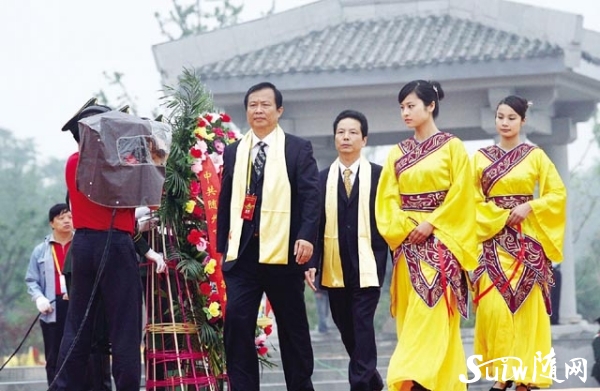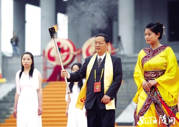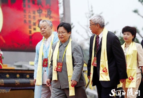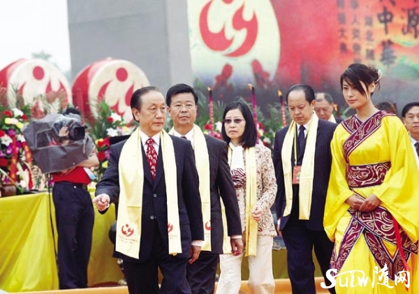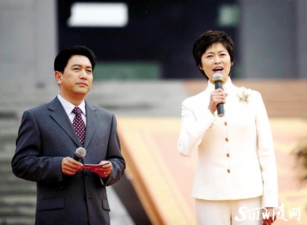 图为 中央电视台主持人水均益(左)、敬一丹(右)主持拜祖大典。