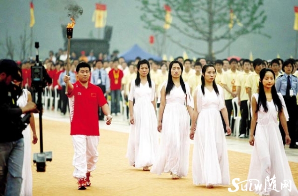 图为 奥运冠军郑李辉(左)在白衣少女的护卫下传递圣火。