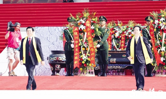 ▲随州市委书记王祥喜(左)、市长刘晓鸣(右)敬献花篮。