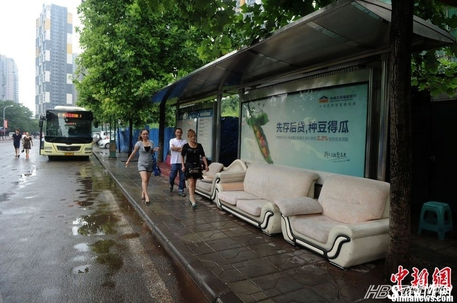 近日,重庆街头一公交车站放置一排沙发供乘客休息,引网友热议。等车乘客悠闲地坐在沙发上玩手机,十分惬意。