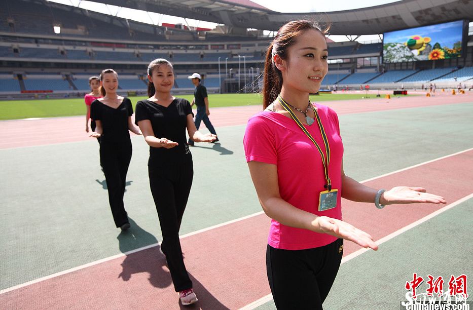亚青会礼仪小姐亮相赛场 演练颁奖礼认真得体