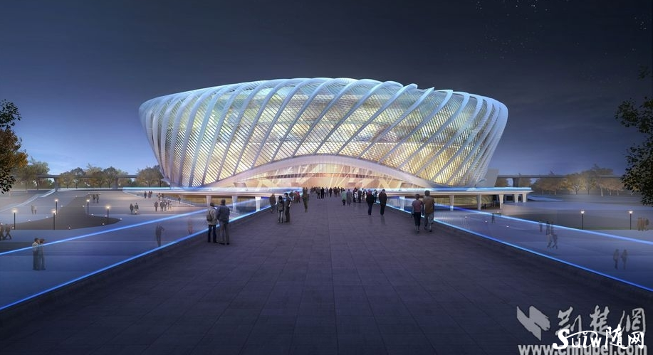 武汉光谷国际网球中心主场馆形似飞速旋转的网球,又如耀眼生辉的桂冠,建筑主体入口处的弧线形构件将平台的静与建筑的动完美结合,以最合理的建筑平衡点营造出富有空间吸引力与视觉冲击力的入口空间。建成后,犹如给二妃山将戴上一顶璀璨的“旋风皇冠”。