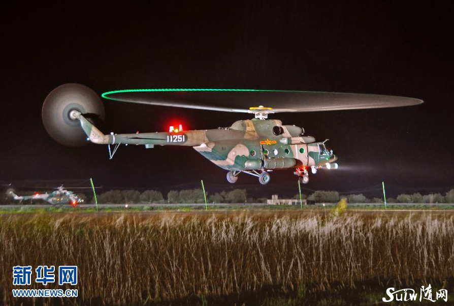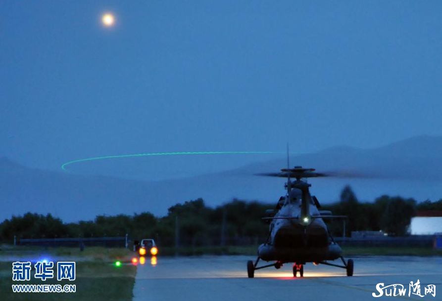 7月21日晚,空军航空兵某团直升机在拉萨某机场实施训练。 7月21日20时,正在雪域高原驻训的空军航空兵某团直升机大队两架直升机相继起飞,在雅鲁藏布江峡谷中往返穿梭,并于22时33分结束飞行平稳着陆。此次夜航训练的成功进行,填补了我军直升机在雪域高原机场夜间训练飞行的空白,标志着该团直升机大队初步具备了在高原地区全时域、全天候执行各类任务的能力。新华社发(李良峰 摄)