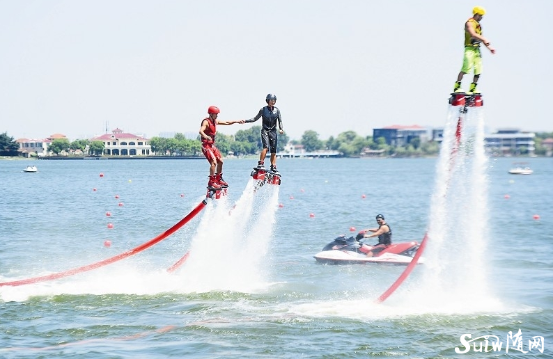 中国特技滑水队3名运动员身穿喷射悬浮飞行器,表演压轴节目“水中飞人” 记者佘影摄