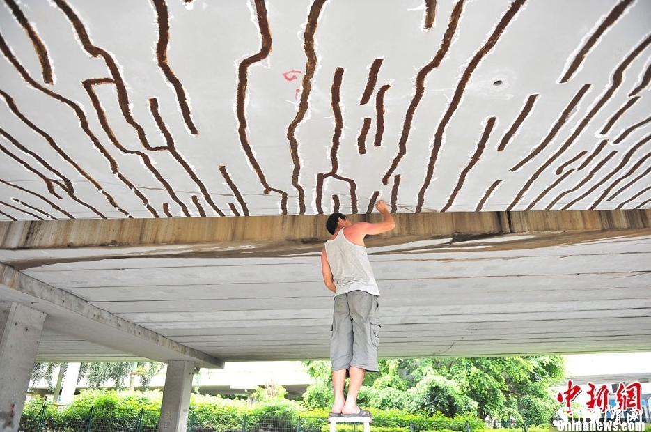 8月7日,海口市南大桥国兴大道引桥桥体出现密密麻麻的裂缝,现场工人正在对桥体裂缝进行修补。骆云飞 摄