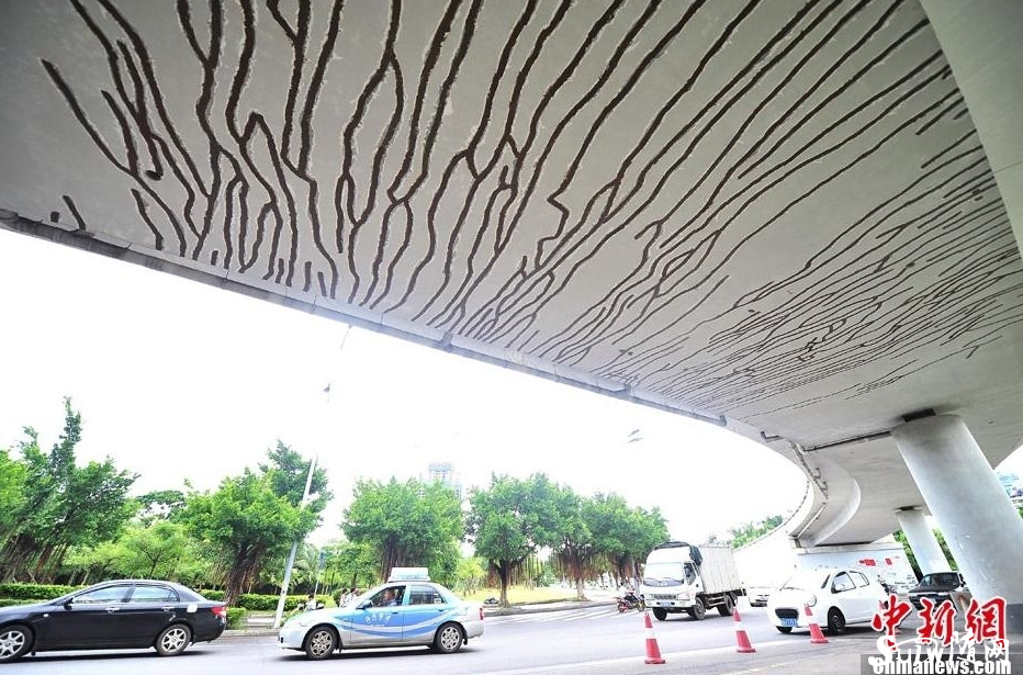 近日,海口市南大桥国兴大道引桥桥体出现200多条裂缝,有的裂缝宽度达到0.25毫米,还有裂缝长度贯穿整个桥梁(100多米),大桥的出口处还出现凹陷路面。海口市桥梁管理有限公司负责人回应称不影响通车安全。中新社发