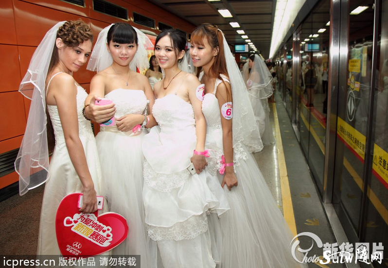 2013年8月12日,广州,百位新娘穿婚纱挤地铁参加摩登百货举行的新娘赛跑,以庆祝七夕节的到来。新娘们从广州海珠区坐地铁到达越秀区,他们的新郎在终点翘首以盼。
