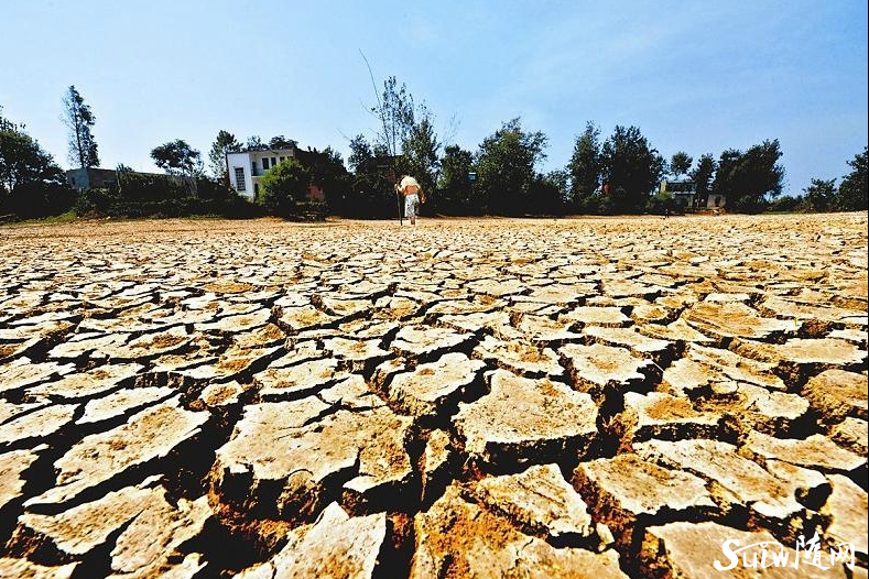 吴店镇水源滚河仅剩一滩浅浅的死水,堰塘基本干涸,干裂的塘底缝隙可以伸进拳头,田间水稻渴盼甘霖。图为:枣阳市吴店镇,干涸的水塘。