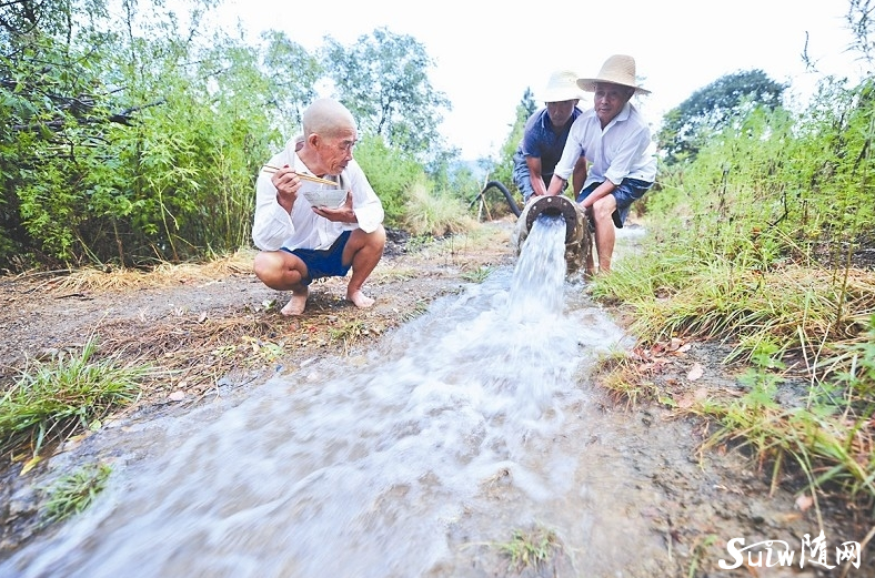 11日下午,咸宁市咸安区大幕乡。常收村张铁水库下有一根水管正在滴水。村民吴海云说,该村100多名村民每天都要日夜在此排队接水。翻过库坝,偌大的水库只剩下一个小水塘。因河水干涸,泉山口村2组数百亩稻田无法灌溉。当地干群在山下的泉眼处筑坝拦水,再用水泵分四级抽到山上水塘,灌溉农田。图为:咸宁市大幕乡泉山口村抽水灌溉山上农田。 |