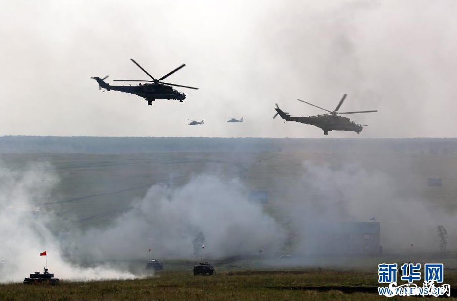 8月15日,在俄罗斯切巴尔库尔合同训练场,中俄陆空协同打击“敌人”。 当地时间15日12时(北京时间14时),“和平使命―2013”中俄联合反恐军事演习在俄罗斯切巴尔库尔合同训练场举行实兵演习。演习以“联合反恐”为课题。双方共投入兵力1000多人,坦克、步战车、自行火炮等近百台,20多架歼击轰炸机和武装直升机参演。新华社发(线云强 摄)
