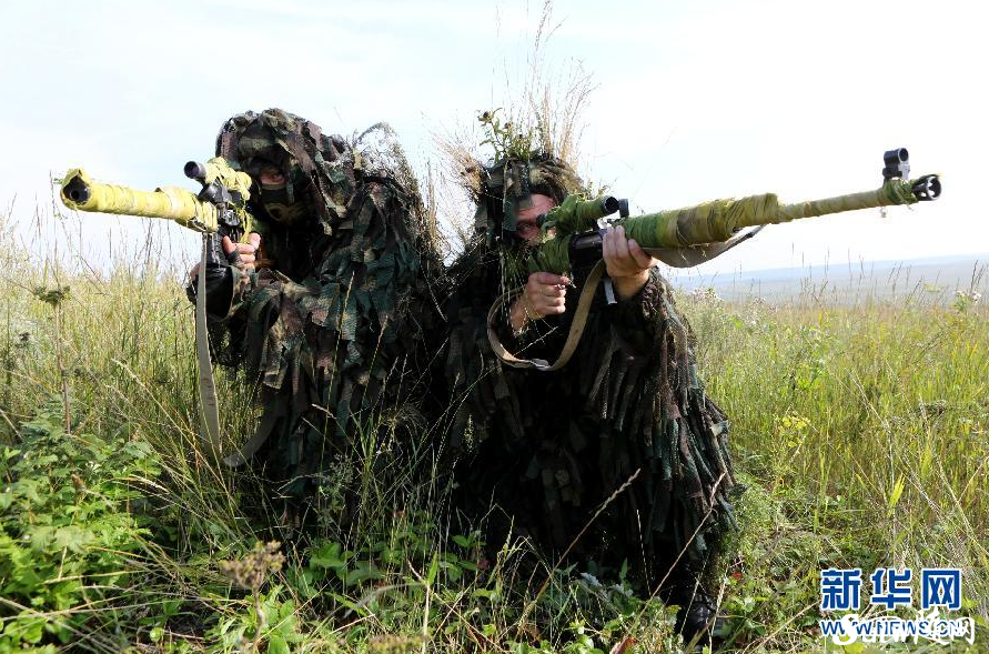 8月15日,在俄罗斯切巴尔库尔合同训练场,俄方狙击手搜索目标准备射击。 当地时间15日12时(北京时间14时),“和平使命―2013”中俄联合反恐军事演习在俄罗斯切巴尔库尔合同训练场举行实兵演习。演习以“联合反恐”为课题。双方共投入兵力1000多人,坦克、步战车、自行火炮等近百台,20多架歼击轰炸机和武装直升机参演。新华社发(线云强 摄) |
