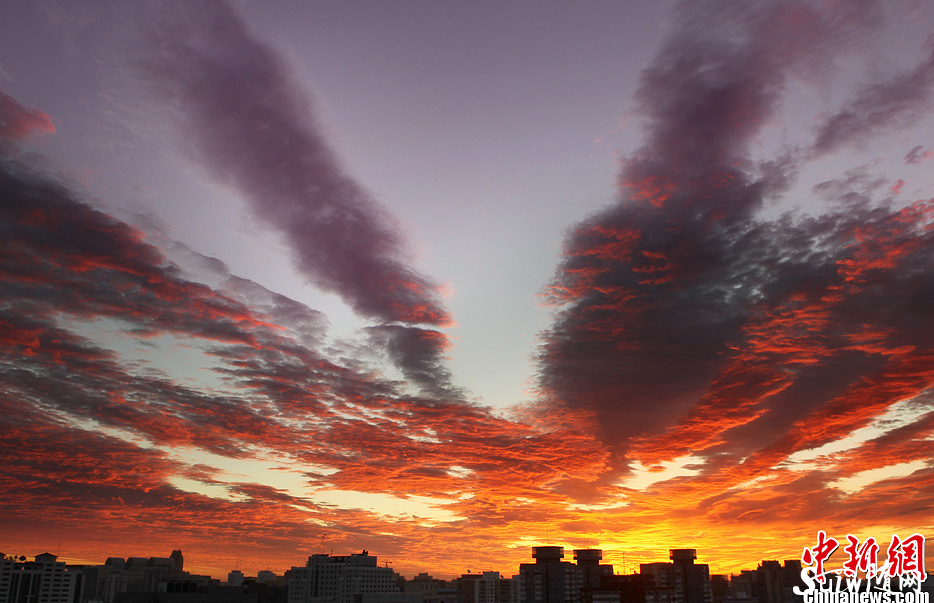 8月18日清晨5时,“火烧云”映红了北京天空,秋风扫去阴霾与湿闷的天气,带来秋高气爽的黄金季节。中新社发 任晨鸣 摄