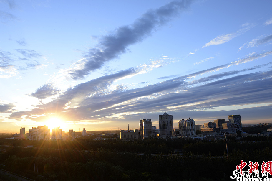 8月18日清晨,北京碧空如洗,天空被迷人的朝霞笼罩,美不胜收。中新社发 侯宇 摄