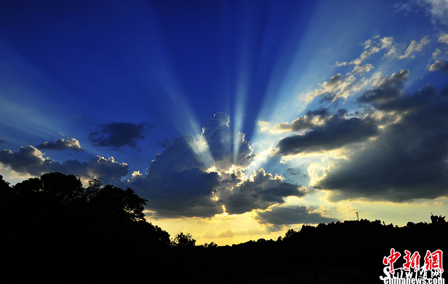近日,摄影爱好者在湖南省张家界慈利县甘堰土家族乡拍摄到了奇光落日美景,云层中放射出的霞光穿云而出,美不胜收。 邵颖 摄