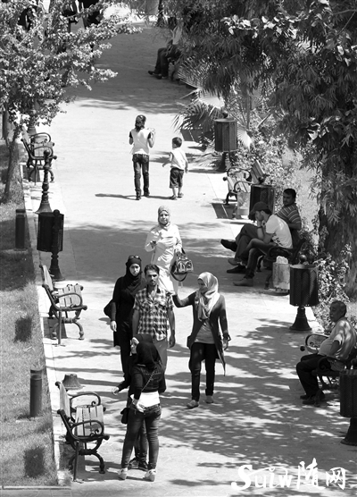 9月5日,叙利亚首都大马士革,市民在街头的一处公园内散步。