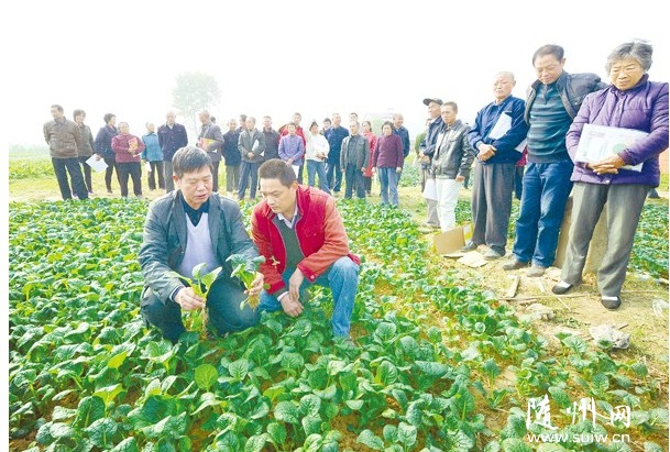 11月7日,随县安居镇农技服务中心主任刘绪旭来到陈家湾村,为该村蔬菜专业合作社的菜农们现场讲解随州泡泡青优种优育知识。