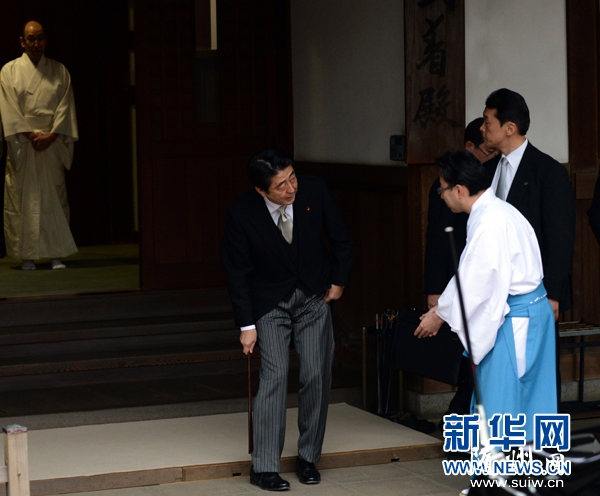 12月26日,在日本东京,日本首相安倍晋三(前)参拜靖国神社。当日,不顾国际社会强烈反对,日本首相安倍晋三悍然参拜供奉有二战甲级战犯的靖国神社。 新华社记者 马平 摄