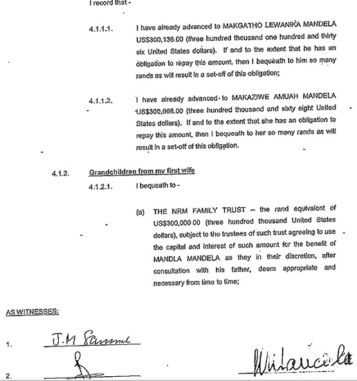 莫塞尼基向媒体宣读了这份长达20多页的遗嘱内容,曼德拉对他三位妻子的子女与孙辈都有所惠及。遗嘱显示,曼德拉已给了在2005年死于艾滋病的儿子马克贾托、三名在世的女儿每人30万美元(约合330万兰特),他还给格拉萨与前夫萨莫拉·马谢尔的两个孩子每人300万兰特。马克贾托一支作为家族的继承者,将获得约翰内斯堡房产。曼德拉给两个儿子留下的孙辈每个人30万美元,给外孙和曾孙以及格拉萨的孙辈每个人10万兰特。此外,一直照顾他的私人助理拉格兰吉等9名身边工作人员也将分别获得5万兰特。