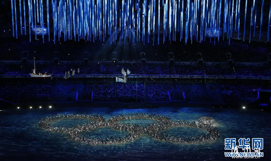 2月23日,演员在闭幕式上组成奥运五环图案时,右上角那一环还未“绽放”。随后在焰火中,五环绽放成功。当日,第22届冬奥会闭幕式在菲施特奥林匹克体育场举行。 新华社记者王丽莉摄
