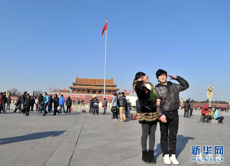 2013年1月16日,雾霾过后,两名游客在北京天安门广场拍照留念。 近三年,北京遭遇过数次较严重的雾霾天气,清风送走雾霾,数次离别,愿再不相见。 新华社记者 李文 摄
