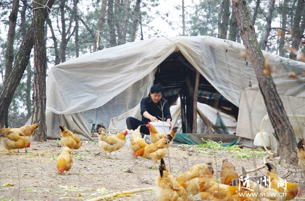 广水市余店镇的养鸡能手蒋如波在浙江、上海等地当过养鸡技术员,还上过央视七套《致富经》节目,去年回到广水市马坪镇当起了老板,租用山场散养土鸡,年创收十多万元。由于长期散养,很多鸡晚上跳上了树枝过夜(图二)。(记者 徐 斌摄)