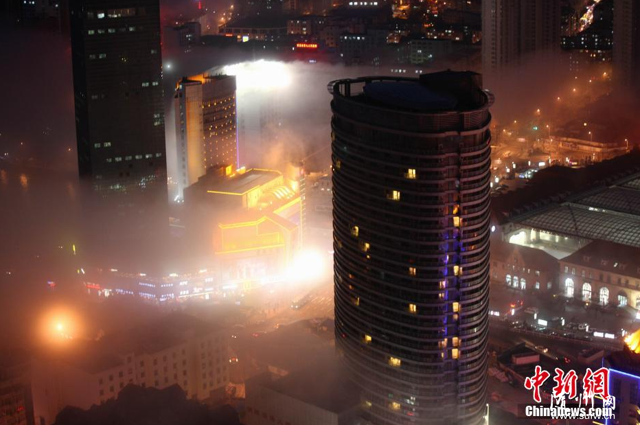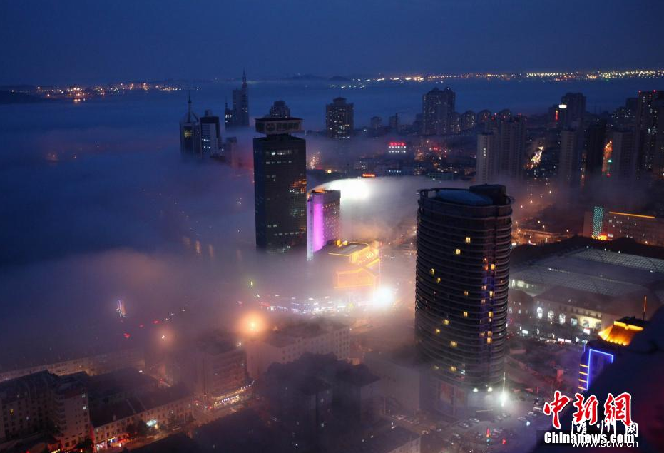 4月2日傍晚,青岛市前海一线出现平流雾美景,夜色中的城市建筑被浓雾缠绕,若隐若现,宛如仙境。平流雾是暖湿空气移到较冷的陆地或水面时,因下部冷却而形成的雾气。青岛地区多在春季发生,范围大,雾较浓,厚度较大,有时可达几百米。中新社发 徐崇德 摄
