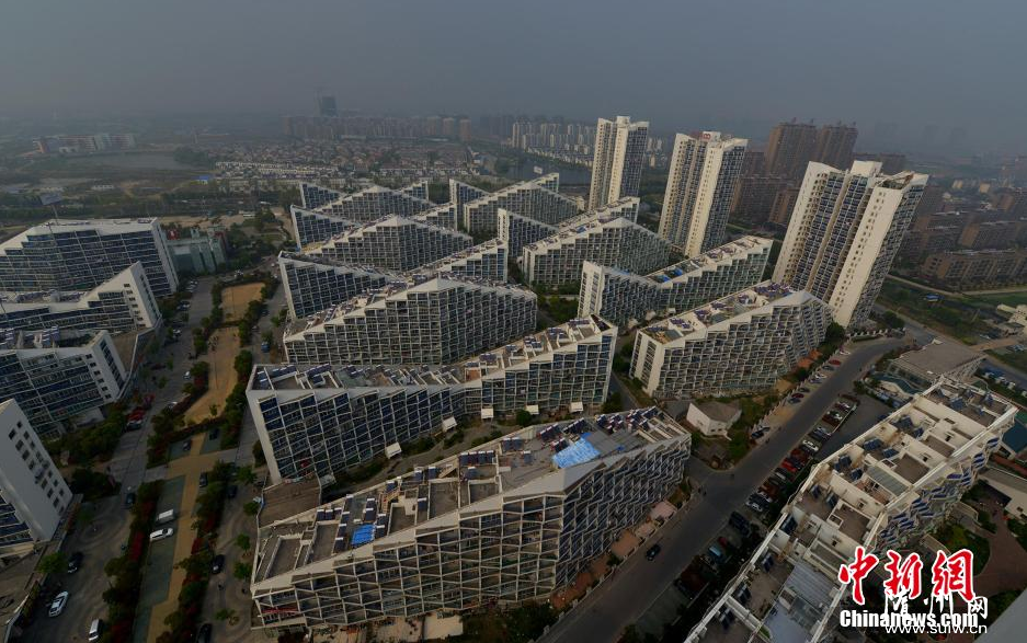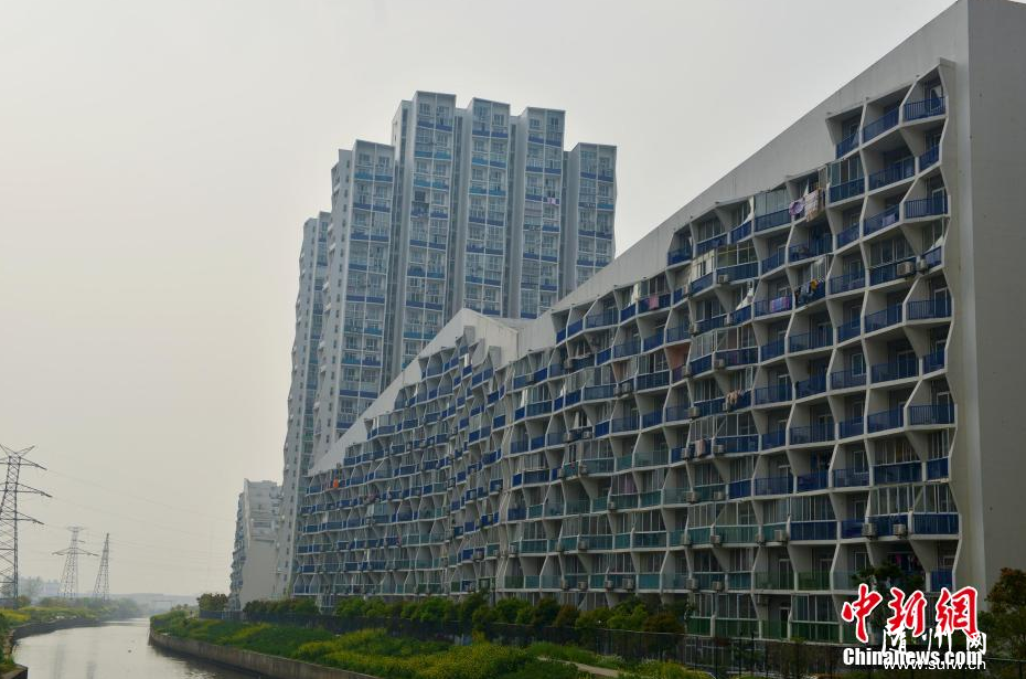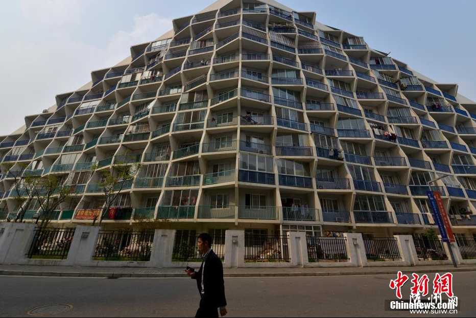 4月8日,无锡惠山区一处小区外立面造型凹凸有致,色彩丰富,十分引人注目。据了解,该楼盘由国外设计师以“波谱”理念设计而成,由于造型较为新颖奇特颇受年轻新市民喜爱,而年长者则多认为“太怪”难以接受。中新社发 李一芳 摄