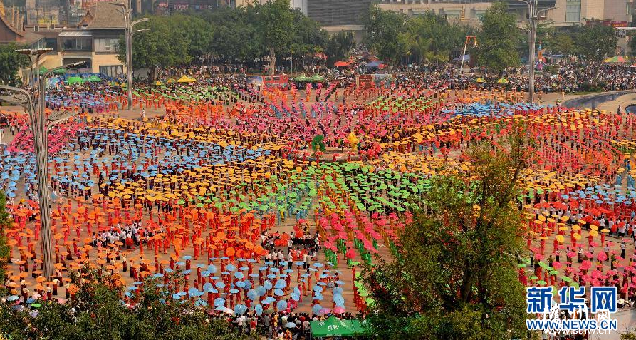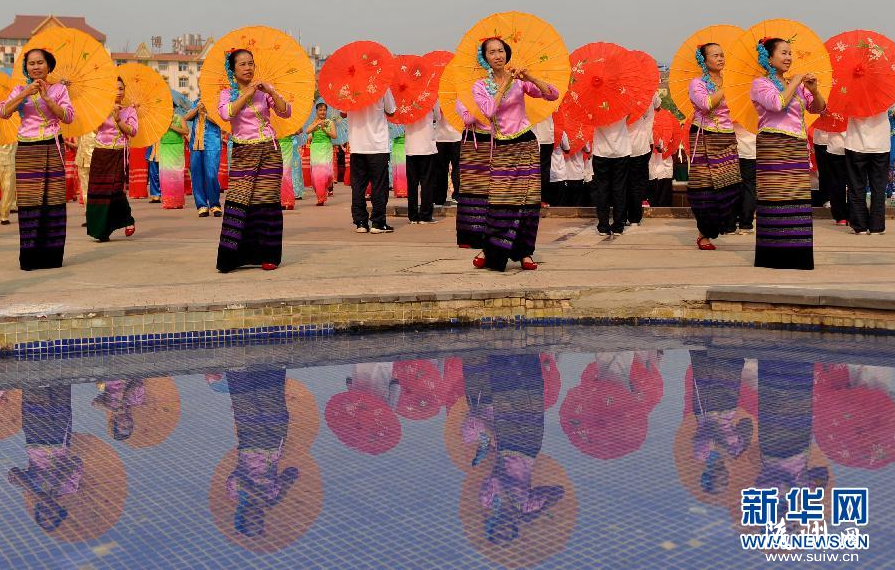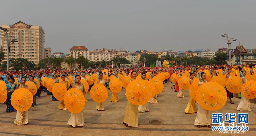 4月14日,上万名群众齐跳傣族伞舞。当日,随着铿锵有力的铓锣声、鼓点声,云南省西双版纳傣族自治州10580名群众身着节日盛装,在景洪市泼水广场上舞动花伞,翩翩起舞。伞舞是傣族传统舞蹈之一,每当傣族泼水节、上新房等喜庆日子来临时,傣家人都要跳起伞舞,场面壮观。新华社记者 蔺以光 摄