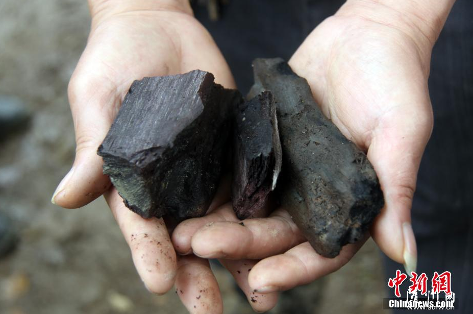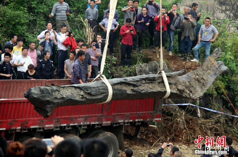 4月16日,江西武宁县政府组织专业人员和机械在该县船滩乡船滩村对“千年乌木”进行开挖,使千年古木得以重见天日。挖掘现场,闻讯而来的附近数千名村民纷纷赶到现场围观,想一睹千年乌木“真容”。经过数个小时的挖掘,现场共挖出“一长三短”共4段乌木,其中最长的一段乌木长10余米,直径约60厘米,3段短的乌木分别长约2到4米,直径20到60厘米不等。图为被起吊机吊起的乌木。魏东升 摄