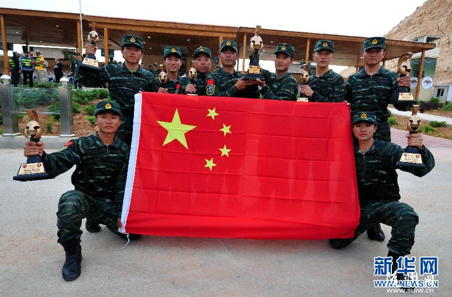 5月5日,在约旦首都安曼阿卜杜拉国王特战训练中心,“雪豹”突击队获奖后合影。当日,为期5天的约旦第六届“勇士竞赛”国际特种兵比武在阿卜杜拉国王特战训练中心落下帷幕,中国武警“雪豹”突击队代表队获得冠军,四川总队特战大队代表队获得亚军,新疆总队特战大队代表队取得第四名。新华社发(程春香摄)