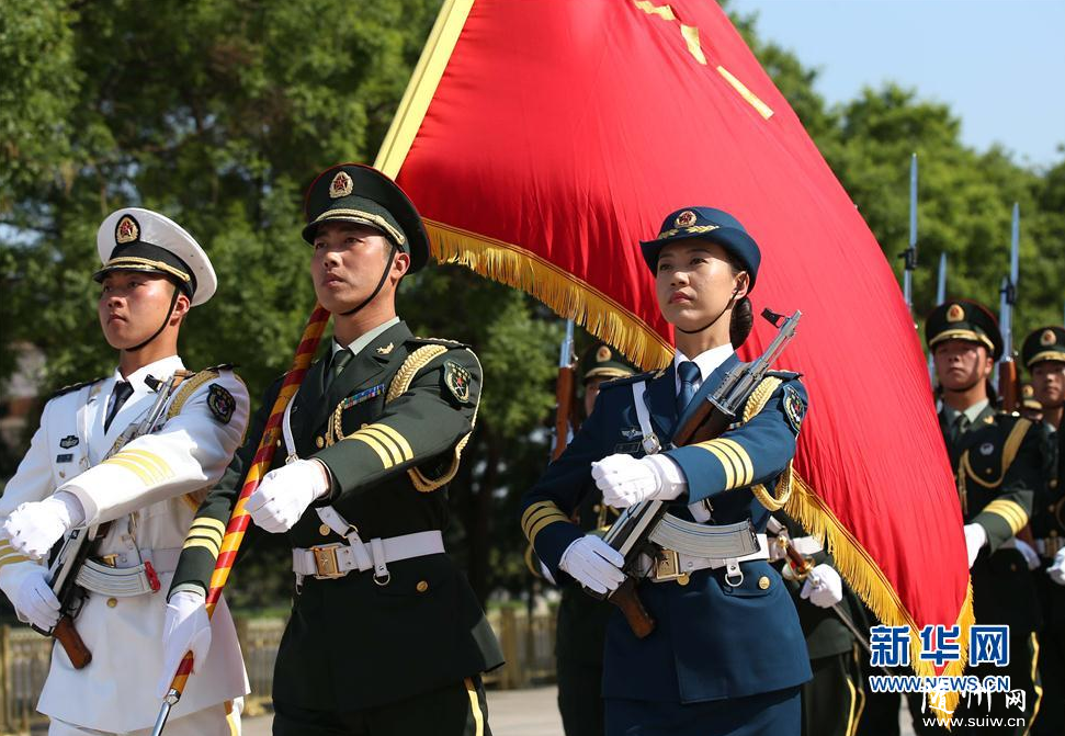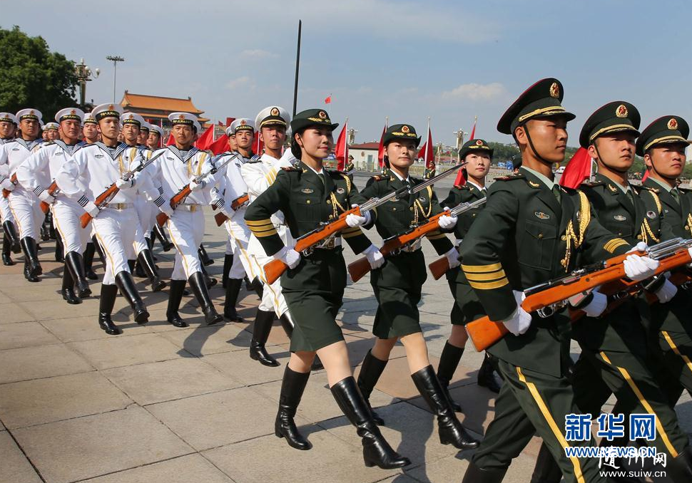 5月12日,我军首批三军女子仪仗兵亮相外交礼仪,接受中外领导人检阅。身着07式礼宾服的13名仪仗队女兵分列在军旗组和陆军、海军和空军军种之中,与男仪仗兵一起伴随检阅曲,手持礼宾枪接受检阅。 |