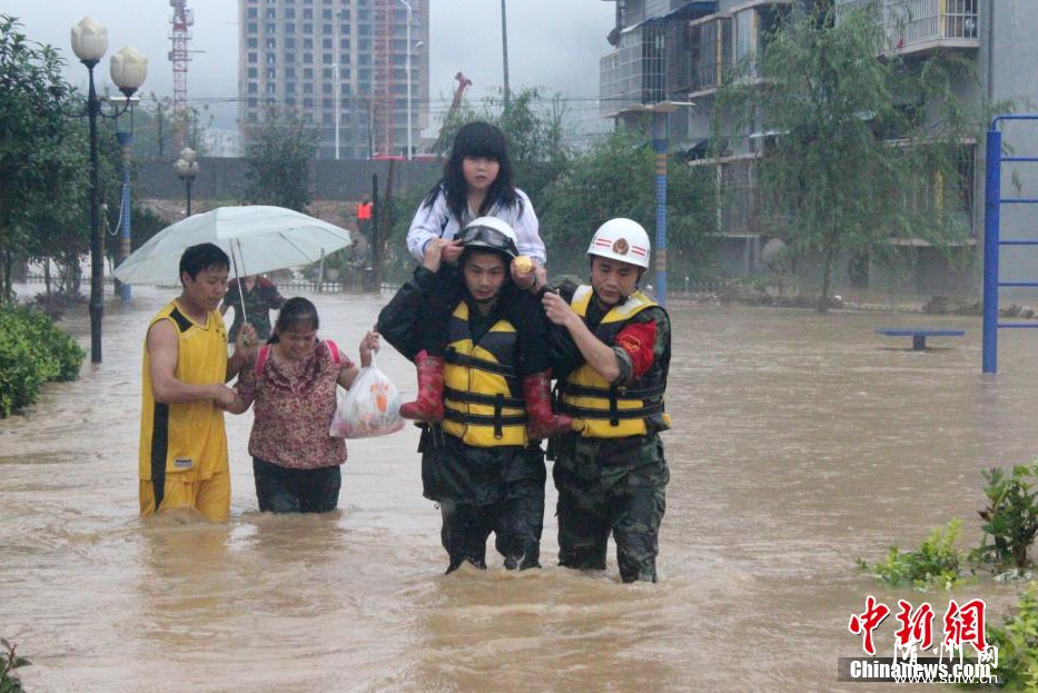 5月25日,贵州省铜仁市江口县因强降雨,致道路溢水中断,商铺、民房被淹受损。近日,贵州多地持续强降雨,全省共57县1013乡镇出现降雨,26个乡镇出现暴雨。图为消防员疏散被困民众。中新社发 田维虎 摄