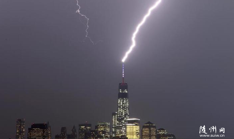 国际在线专稿:据雅虎新闻网5月24日报道,当地时间23日晚间到24日凌晨,美国纽约遭遇暴风雨和闪电袭击。其间,闪电多次击中世贸中心顶部,呈现出史诗般壮观景象,不少摄影爱好者捕捉了到了这一震撼画面。