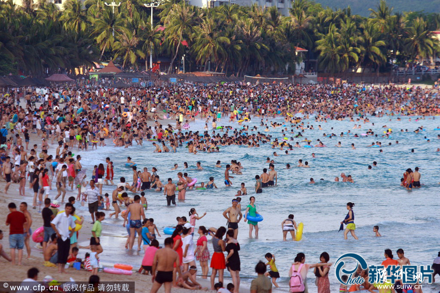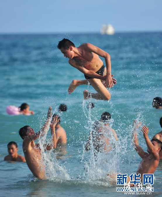 2014年6月2日,海南省三亚市,端午节当天,上万名市民及游客踊到大东海洗龙水,热热闹闹过端午节。上万市民及游客洗龙水。图片来源:东方ic